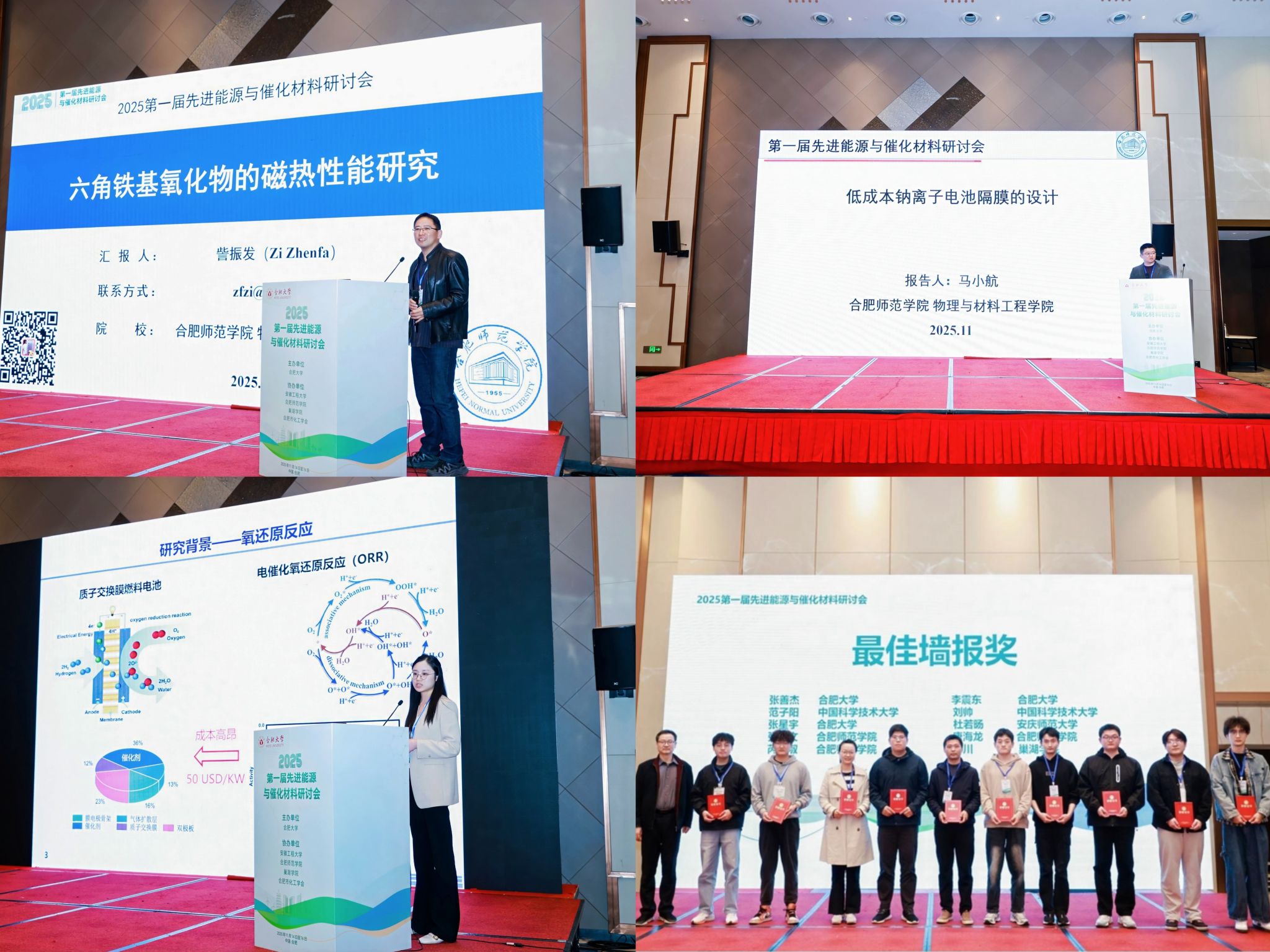 会议期间,我校物材学院訾振发教授、马小航教授、李晶晶博士受邀作专题报告,分别围绕“六角铁基氧化物的磁热性能研究”、“低成本钠离子电池隔膜的设计”、“面向酸性氧还原的高效传质催化剂”等前沿课题分享最新研究成果,与参会学者展开深入研讨,获得广泛关注。此外,物材学院18位教师携研究成果参与墙报展示环节,其中张天文、芮品淑、唐海龙三位老师成果经专家评审荣获“优秀墙报奖”,充分彰显了学院在新能源领域的学术创新能力。