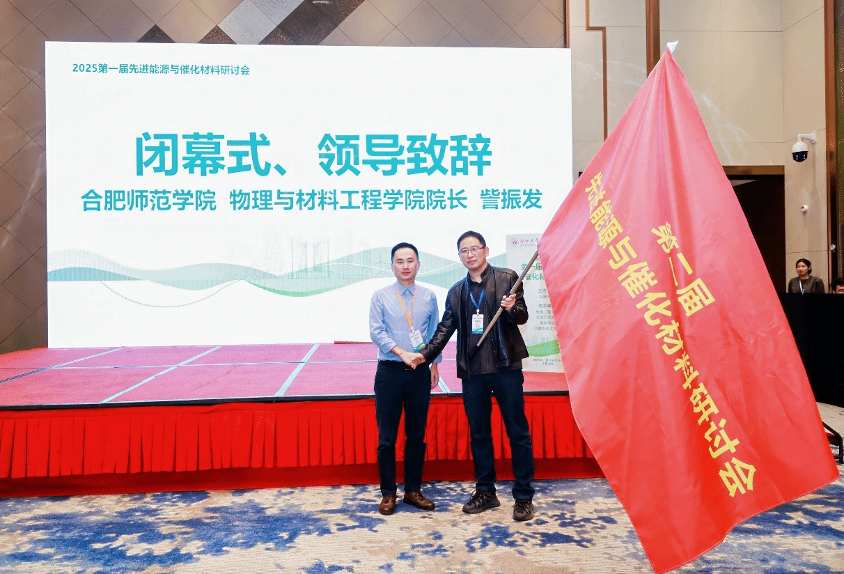 在会议闭幕式上,举行了隆重的会旗交接仪式。訾振发教授接过象征承办权的会旗,标志着第二届先进能源与催化材料研讨会将于两年后由我校主办。这一交接不仅是对我校科研工作的认可,更为我校未来深化科研合作、引领学科发展注入新动力。