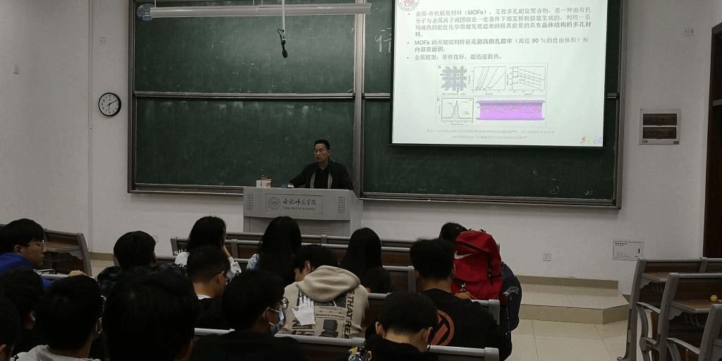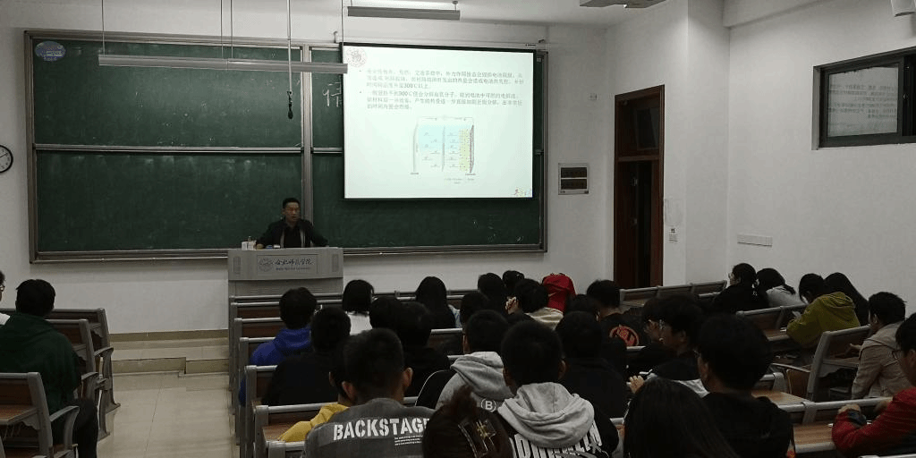 李冬鹏老师报告的主题为“新型电池材料与纳米材料简介”。李冬鹏老师首先简单介绍了我国的汽车发展史和面临的油气资源匮乏等问题,指出国家发展新能源电池的战略思考和做法。结合本科生所具备的物理学知识,李老师通过对比铅酸电池的能量密度、循环寿命和产业链存在的污染等问题,分析了锂电池的性能优点。其次,基于目前普遍使用的三元锂电池存在的含有液态有机电解液,有可能发生漏液、起火甚至爆炸等安全隐患,有机电解液自身电化学窗口较窄、易分解和工作温度受限等问题,李老师向同学们介绍了聚合物全固态锂电池的优点和目前的实验研究进展情况,使同学们对新能源电池的发展前景有了比较清晰的认识。