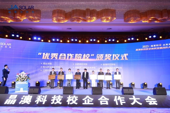 本网讯4月20日,晶澳科技2023年校企协同发展合作大会在河北宁晋成功举办,来自全国41所本科、职业院校参会,tyc41183太阳成集团应邀代表学校出席大会。会上,我校被授予“优秀合作院校”,并与晶澳合肥基地一起荣获“优秀校企合作基地”。