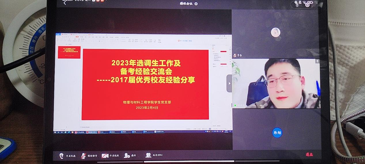 为更好推进2023届毕业生就业工作,发挥选调生就业典型的示范作用,促进毕业生更充分高质量就业,2月3日,物材学院在线上举办选调生报考组织工作会及备考经验分享会。会议邀请了2017届优秀毕业生、选调生宋庆忠做交流分享,全体学生党员、部分入党积极分子参加会议,学院党委副书记吴震出席会议。会议由学院学生第二党支部书记韩翔主持。