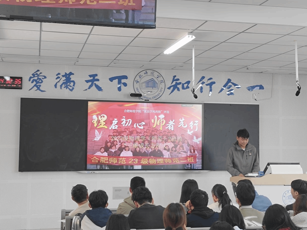 班级汇报环节紧凑高效、亮点纷呈。新能源、材料、光电专业以科技创新为核心,展现优异的科创成果,更彰显坚定的科研报国决心;物理学(师范)专业创新构建“三维成长”方程式模型,在奉献与自我磨砺中成长,以昂扬姿态向“四有好老师”目标奋进,各班级以鲜活的集体故事和饱满的情感表达,展现出强大的班级凝聚力与感染力。