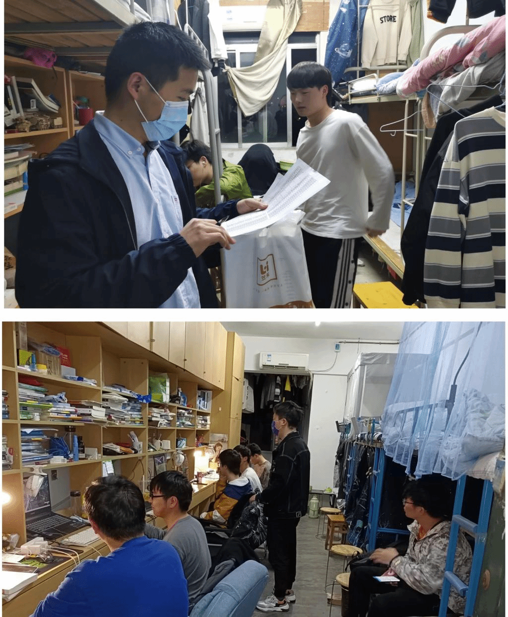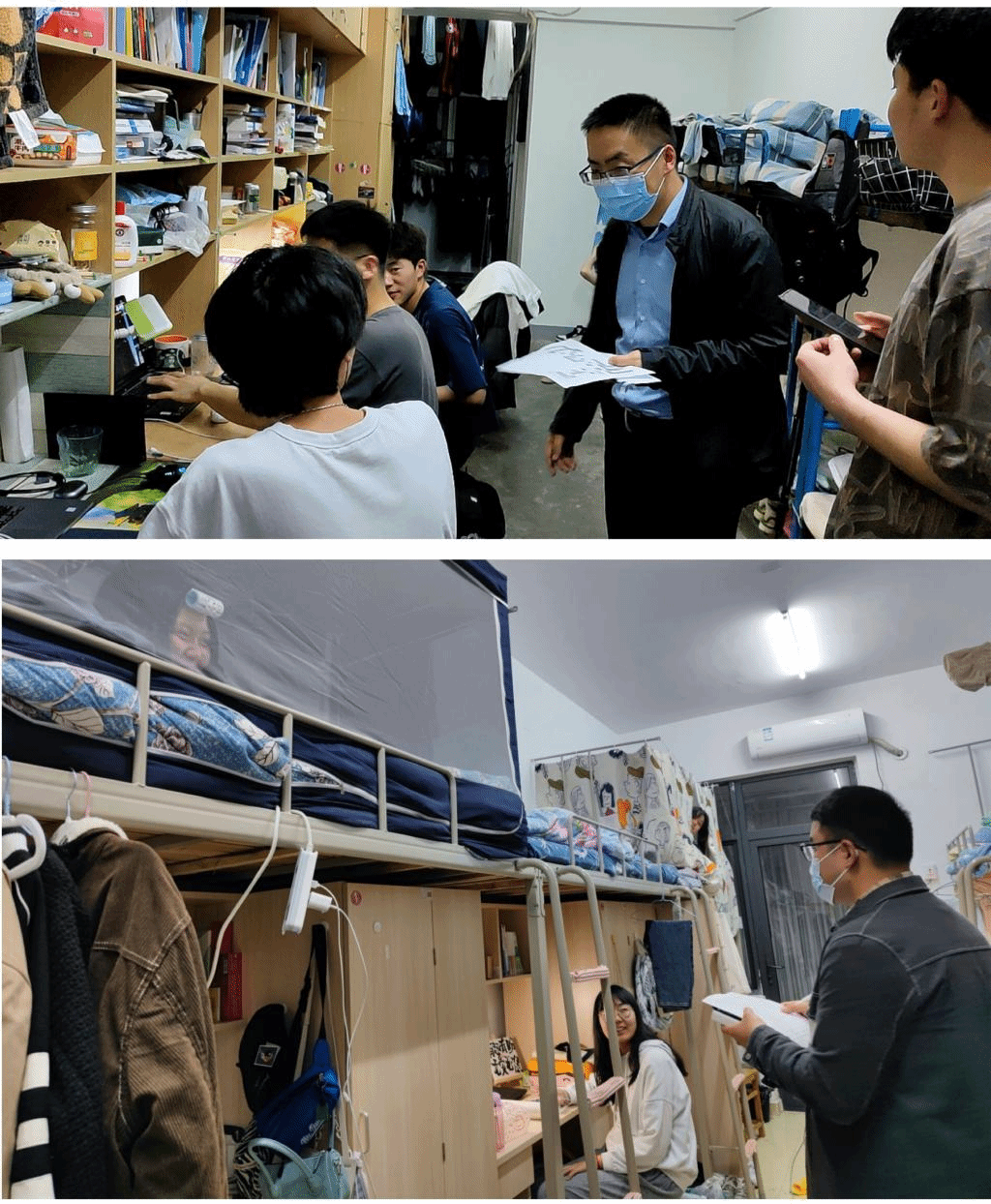 老师们逐一对宿舍安全隐患开展排查,并对学生在校情况进行摸排,期间,老师与同学们就宿舍安全、疫情防控、学生就寝、请(销)假、就业择业、毕业论文等问题进行了亲切交流。