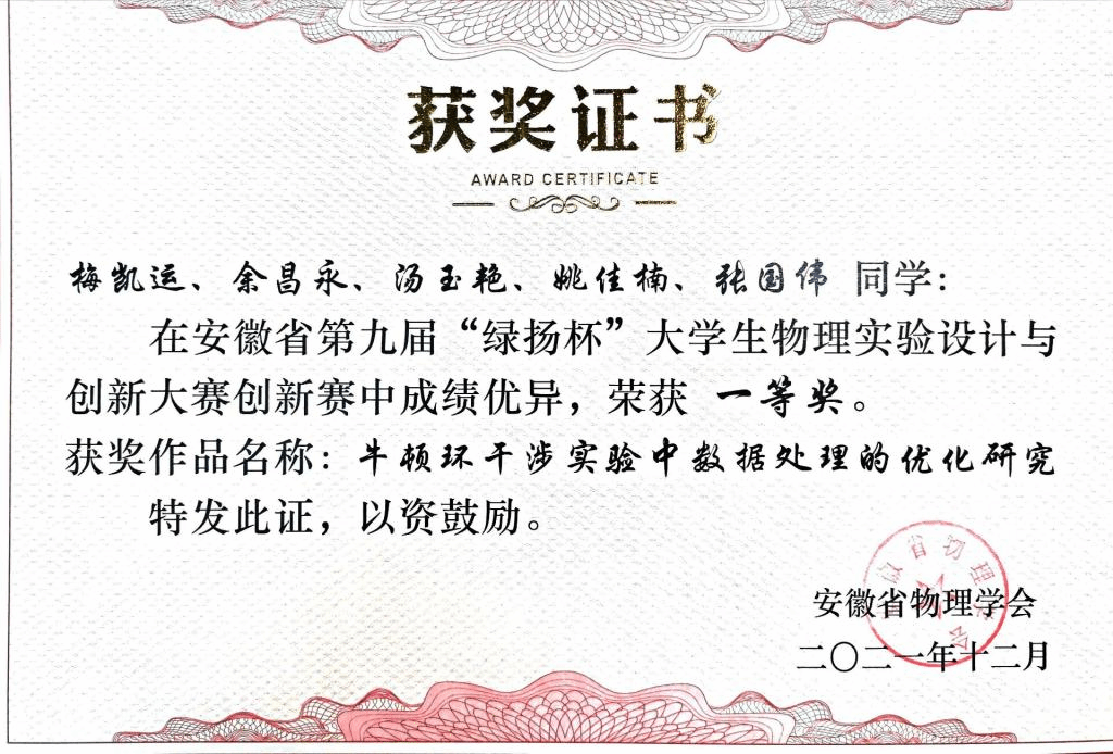 近期,2021年第九届安徽省大学生物理实验设计与创新大赛结果揭晓,我院三个参赛团队分别获得一个一等奖、两个三等奖。其中,tyc41183太阳成集团李仁文老师指导的梅凯运、余昌永、汤玉艳、姚佳楠、张国伟团队作品《牛顿环干涉实验中数据处理的优化研究》获一等奖;李仁文老师指导的汤玉艳、梅凯运、余昌永、张国伟、姚佳楠团队作品《牛顿环干涉实验中螺钉压力影响规律的探究》,陶蕊、冯源、李冬鹏老师指导的张翰明、李刚宇、刘瀚扬、伍宏伟、郜栋梁团队的作品《纹影效应演示仪》分别获得三等奖。