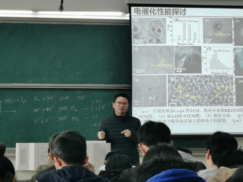 鲁海胜老师首先介绍了双功能过渡金属基纳米材料的制备、结构以及应用,并着重介绍了钴铁双金属纳米粒子在电解水领域的应用。主题报告结束后,鲁海胜老师与同学们进行了深入互动交流和讨论,并结合自身的求学经历鼓励同学们认真学习专业知识,积极参与导师的学术课题,培养科研创新思维,为今后的工作或者进一步学习深造打下坚实的基础。